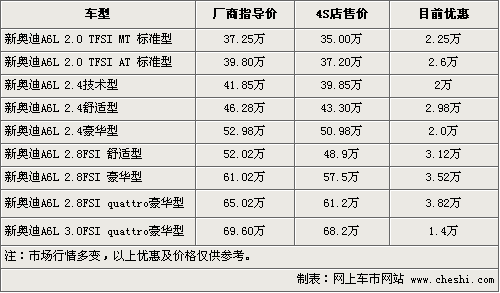 新款?yuàn)W迪A6L通過(guò)外觀和安全等方面的改款升級(jí),在同級(jí)別車(chē)型中擁有了更高的性?xún)r(jià)比,入門(mén)級(jí)車(chē)型價(jià)格更能夠比拼寶馬3系等對(duì)手。根據(jù)網(wǎng)上車(chē)市價(jià)格監(jiān)測(cè)系統(tǒng)顯示,目前奧迪A6L全系優(yōu)惠幅度有進(jìn)一步增加,2.0入門(mén)車(chē)優(yōu)惠后僅售35萬(wàn),具體車(chē)型以及價(jià)格如下: