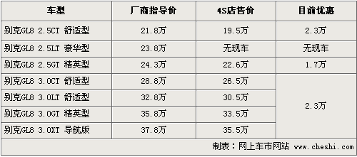 別克GL8是MPV市場(chǎng)一款非常受歡迎的車型,成為公司和商務(wù)用車的主要選擇對(duì)象,被稱為“陸上公務(wù)艙”。根據(jù)網(wǎng)上車市價(jià)格監(jiān)測(cè)系統(tǒng)顯示,目前這款車的優(yōu)惠幅度在原來(lái)2萬(wàn)元基礎(chǔ)上增加到了2.3萬(wàn)元,具體車型以及價(jià)格如下: