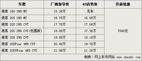 據(jù)4S店銷售人員介紹,消費者現(xiàn)在購買逍客可以優(yōu)惠現(xiàn)金7000元,部分4S店可以優(yōu)惠到8000元現(xiàn)金,但必須在店內(nèi)做全車保險。目前,2.0排量兩驅(qū)手動擋、自動檔,四驅(qū)兩款車型均有現(xiàn)車供應(yīng),現(xiàn)車顏色主要為黑色,紅色,白色,銀色等。同時備受關(guān)注的1.6限量版車型,部分4S店可以先交訂金,由于廠家排產(chǎn)原因,具體交車日期還不能確定。
