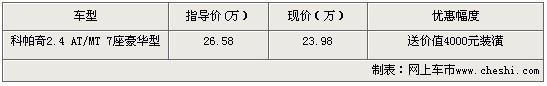 雪佛蘭Captiva科帕奇不僅豐富了雪佛蘭產品陣容,深化了雪佛蘭年輕活力、值得信賴的國際化品牌內涵,更填補了上海通用汽車在中檔SUV細分市場上的空白。近日根據網上車市價格監(jiān)測系統(tǒng)顯示,上海地區(qū)購買雪佛蘭科帕奇2.4 AT/MT 7座豪華型 可以得到2.6萬元的價格優(yōu)惠。具體車型報價如下表: