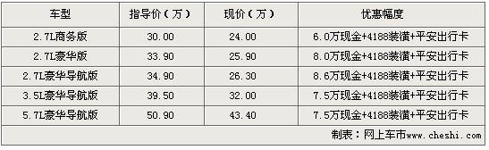 克萊斯勒300c 更讓人稱道的是其美國(guó)國(guó)家五星級(jí)安全標(biāo)準(zhǔn)配置。 大燈噴淋、倒車?yán)走_(dá)、緊急制動(dòng)助力、電動(dòng)防夾車窗等配置使300c 于2006年榮登《福布斯》美國(guó)市場(chǎng)十大最安全車型。 近日根據(jù)網(wǎng)上車市價(jià)格監(jiān)測(cè)系統(tǒng)顯示,上海地區(qū)購(gòu)買克萊斯勒300C全系最高可以得到8.6萬(wàn)元的現(xiàn)金優(yōu)惠。具體車型價(jià)格如下:
