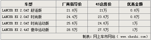 以純進(jìn)口車身份銷售的三菱LANCER EX上市后,憑借上佳的質(zhì)量及性能受到消費(fèi)者喜愛。據(jù)網(wǎng)上車市網(wǎng)站得到的消息,近期北京各家進(jìn)口三菱經(jīng)銷商處已經(jīng)出現(xiàn)了價格松動,除低配車型優(yōu)惠仍為8000元外,2.0L高配車型以及頂配的2.4L豪華運(yùn)動版車型均可給出10000元優(yōu)惠。詳情如下: