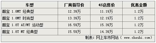 酷寶系列車型,不僅外形時尚,動力也相當充沛,不僅可與進口跑車如蓮花競速相媲美,也帶動了自主跑車市場的競爭。近期網(wǎng)上車市網(wǎng)站了解到,隨著市場競爭的加劇,現(xiàn)在各家4S店均可給出全系12000元的現(xiàn)金優(yōu)惠,令此車型再次引起關(guān)注。具體詳情如下: