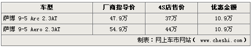據(jù)4S店銷售人員介紹,目前薩博9-5在售車型各店內(nèi)現(xiàn)車較少,雖然優(yōu)惠幅度較大但是仍需消費(fèi)者提前預(yù)訂,訂金2萬(wàn)。繳納訂金約兩周后既可提車,提車時(shí)付清全款即可,全系車型均可享受到最高10.9萬(wàn)的優(yōu)惠。問(wèn)及其它而頓優(yōu)惠活動(dòng)時(shí),銷售人員表示之前曾經(jīng)有過(guò)優(yōu)惠達(dá)12.9萬(wàn)的特價(jià)車,但僅有一輛。