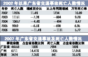 2007年,廣東省與廣州市地區(qū)均實(shí)現(xiàn)道路交通事故四項(xiàng)指數(shù)下降的目標(biāo)和特大交通事故大幅下降的目標(biāo),創(chuàng)造了道路交通事故死亡人數(shù)連續(xù)“五年連降”的成績,2007年更是首次沒有發(fā)生一次死亡10人以上的惡性交通事故。