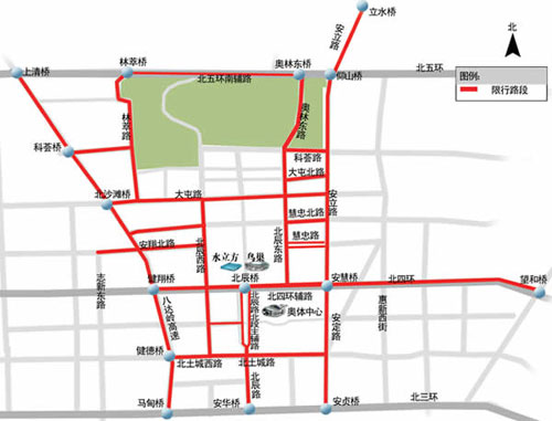 限行路段:建國門橋向北經東二環(huán)路、北二環(huán)路主路(不含輔路)至鐘樓北橋(單向);復興門橋向北經西二環(huán)路、北二環(huán)路主路(不含輔路)至鐘樓北橋(單向),除奧運專用車輛、公共汽車和持有閉幕式車證的車輛外,禁止其他車輛通行。