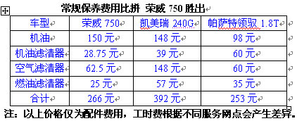 僅從配件的費(fèi)用來(lái)看,帕薩特領(lǐng)馭1.8T和榮威750的價(jià)格優(yōu)勢(shì)明顯,考慮到上海大眾保養(yǎng)工時(shí)收費(fèi)較高,綜合看來(lái),榮威750使用3年在保養(yǎng)費(fèi)用的支出上最具優(yōu)勢(shì),而凱美瑞240G不但配件價(jià)格昂貴,據(jù)了解保養(yǎng)一次的工時(shí)收費(fèi)在200元左右,是三款車(chē)型中最貴的,日常使用成本較高。