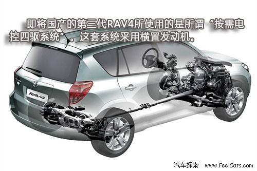 但值得注意的是,之前兩代RAV4采用的都是全時(shí)四驅(qū)系統(tǒng),與此相配合發(fā)動(dòng)機(jī)也使用了縱置的設(shè)計(jì)。而即將國(guó)產(chǎn)的第三代RAV4所使用的是所謂“按需電控四驅(qū)系統(tǒng)”(Electronic On-DeMand 4-wheel drive)。這套系統(tǒng)采用橫置發(fā)動(dòng)機(jī),在需要時(shí)通過液力粘性耦合器將動(dòng)力傳至后輪。