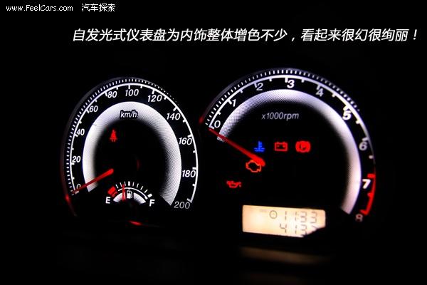 比較夢(mèng)幻的是絢麗的儀表。黑色的表底下白色泛出的刻度以及紅色的指針很是顯眼。面積雖然不大,但為整個(gè)內(nèi)飾都呈現(xiàn)出一種比較有檔次的效果。上面的擋板保證了其自發(fā)光的設(shè)定時(shí)刻都不會(huì)因?yàn)殛?yáng)光的原因而影響讀取信息,當(dāng)然如果面積更大一些的話,那感覺(jué)就會(huì)更好一些。