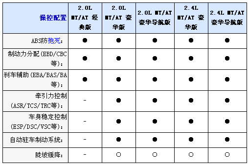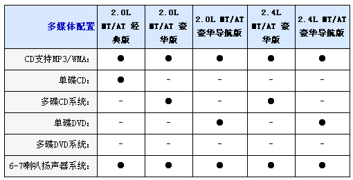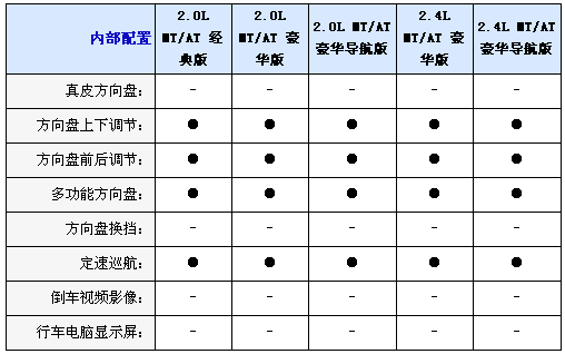 內(nèi)飾方面2.0L均配備織物座椅,而2.4L車型則采用真皮坐椅并且配備電加熱座椅,并且2.0L配備6向手動調(diào)節(jié)駕駛座椅,而2.4L配備8向電動調(diào)節(jié)并且代腰部支撐的駕駛座椅,不過副駕駛?cè)囅抵粯?biāo)配4向手動調(diào)節(jié)座椅,另外入門級車型只配備CD播放器,2.0L和2.4L豪華型采用6CD播放器,而2.0L和2.4L豪華導(dǎo)航型配備DVD播放器和6.5寸寬屏液晶顯示器;包括導(dǎo)航功能,全系標(biāo)配6喇叭揚(yáng)聲器、多功能方向盤自動分區(qū)空調(diào)和后排足部出風(fēng)口。