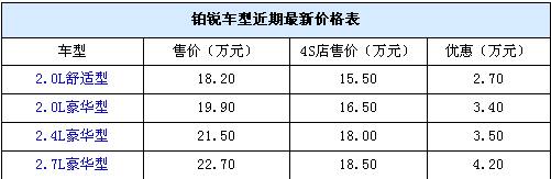 我們汽車之家獨(dú)家了解到有關(guān)鉑銳車型的最新優(yōu)惠措施。近日,龐大汽車集團(tuán)下屬的北京冀東通4S店獨(dú)家買斷了一批鉑銳車型,并以非常低的價(jià)格進(jìn)行銷售: