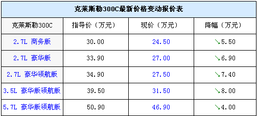 目前克萊斯勒300C現(xiàn)車狀況一般,不同經(jīng)銷商處現(xiàn)車數(shù)量及車型顏色不同,從我們了解的情況來看現(xiàn)300C全系最高優(yōu)惠8萬元左右,2.7L低配車型的價(jià)格僅為24.5萬元,優(yōu)惠最大的3.5L豪華領(lǐng)航版售價(jià)31.5萬元,性價(jià)比不錯(cuò),感興趣的朋友可以與經(jīng)銷商聯(lián)系,來店詳談價(jià)格還能再低一些。