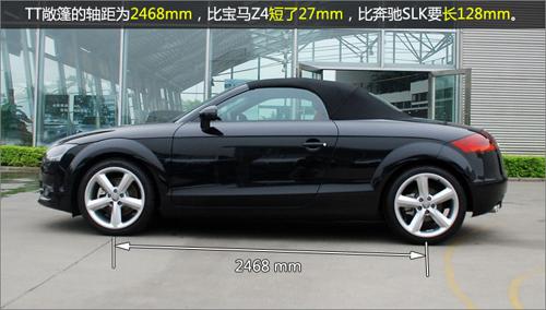 奧迪TT敞篷的軸距為2468mm,與另外兩個來自德國的競爭對手相比,奧迪TT的軸距比寶馬Z4短了27mm,比奔馳SLK要長128mm。