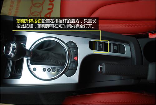 開啟軟頂?shù)陌粹o在變速桿的后方位置。該按鈕的形狀與普通的車窗升降按鈕無異,而實際操作的方法也一模一樣。只需長按該按鈕20余秒,頂棚即可完全放下。藍天白云就在頭頂?shù)母杏X真好。