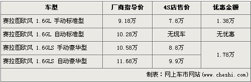 據(jù)經(jīng)銷商處銷售人員介紹,賽拉圖歐風(fēng)全系最高出現(xiàn)1.78萬元的優(yōu)惠。賽拉圖歐風(fēng)在售的有4個(gè)車型,入門級(jí)的1.6L手動(dòng)標(biāo)準(zhǔn)版經(jīng)1.38萬元的優(yōu)惠后,售價(jià)從廠商指導(dǎo)價(jià)9.18萬元降到7.8萬元,1.6L豪華版的手動(dòng)版和自動(dòng)版車型都經(jīng)全系最高1.78萬元優(yōu)惠后,售價(jià)分別降至8.8萬元和9.9萬元。經(jīng)銷商處銷售人員還介紹,由于1.6L自動(dòng)標(biāo)準(zhǔn)型沒有現(xiàn)車所以沒有在此次優(yōu)惠的列隊(duì)中,其他車型店內(nèi)現(xiàn)車充足。