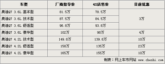 據(jù)奧迪4S店銷售人員介紹,目前銷售的奧迪Q7包括了3.6和4.2排量共7款車型。消費(fèi)者在購(gòu)買的同時(shí)可以選擇個(gè)性化選裝配置,其中包括了座椅顏色,內(nèi)飾顏色,剎車盤(pán),音響等一系列配置,據(jù)介紹,選擇個(gè)性化配置后,車價(jià)將有相應(yīng)增加。同時(shí)消費(fèi)者可以直接購(gòu)買原車型,目前全車系3.6排量三款車優(yōu)惠3萬(wàn)元現(xiàn)金,豪華版優(yōu)惠4萬(wàn)。而4.2舒適型最低可優(yōu)惠到135萬(wàn),降幅達(dá)23萬(wàn)。目前4S店現(xiàn)車主要以黑色為主,內(nèi)飾有灰色、米色可供選擇。