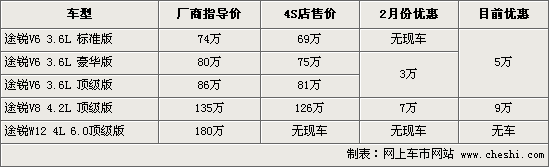 筆者從進(jìn)口大眾經(jīng)銷商處了解到,相比2月份途銳的優(yōu)惠幅度,目前優(yōu)惠有進(jìn)一步加大,其中途銳V6三款車優(yōu)惠現(xiàn)金5萬(wàn)元,而途銳4.2L頂級(jí)版則優(yōu)惠9萬(wàn)元現(xiàn)金,比上月優(yōu)惠幅度均增加2萬(wàn)元。但據(jù)4S店銷售人員介紹,目前3.6標(biāo)準(zhǔn)版和6.0頂級(jí)版尚沒(méi)有現(xiàn)車,其他各款有黑色和銀色可選擇,但數(shù)量非常少。在內(nèi)飾顏色方面,途銳有米黃色、灰色、黑色和棕色四款可供選擇,而一般大眾顏色為米黃和灰色。近期,途銳將有部分新車到店,消費(fèi)者可到4S店看車試駕。
