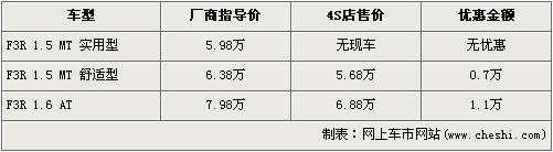 據(jù)比亞迪汽車北京地區(qū)4S店銷售人員介紹,比亞迪F3R全系均有優(yōu)惠,最高配的1.6L自動(dòng)檔車型的優(yōu)惠金額為1.1萬(wàn)元,達(dá)到了全系最高,1.5手動(dòng)舒適版優(yōu)惠金額為7000元。經(jīng)過(guò)優(yōu)惠后,1.5L手動(dòng)舒適型的售價(jià)降為5.68萬(wàn)元,頂配的1.6L自動(dòng)檔售價(jià)降為了6.88萬(wàn)元。銷售人員還介紹,1.5L手動(dòng)實(shí)用版已無(wú)現(xiàn)車,所以不在此次優(yōu)惠范圍內(nèi)。