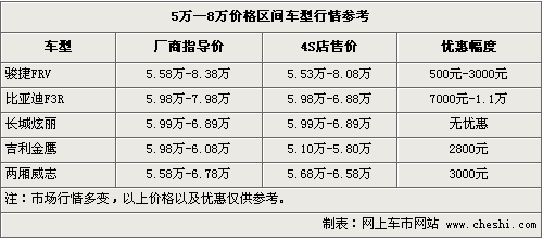 二、價(jià)位在5萬(wàn)—8萬(wàn)元之間的車型多少顯得有點(diǎn)尷尬,但是像剛上市沒多久的駿捷FRV、長(zhǎng)城炫麗還是引來(lái)不少的關(guān)注度。這個(gè)區(qū)間車型在價(jià)格,配置,安全和舒適度方面表現(xiàn)都比較中庸。但是在駿捷FRV的身上我們能夠看到自主品牌的長(zhǎng)足進(jìn)步。