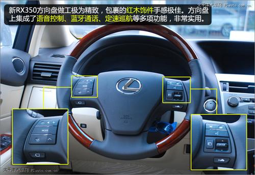 新RX350方向盤做工極為精致,包裹的木質(zhì)飾件手感極佳。方向盤上集成了語音控制、藍(lán)牙通話、定速巡航等多項(xiàng)功能,非常實(shí)用。