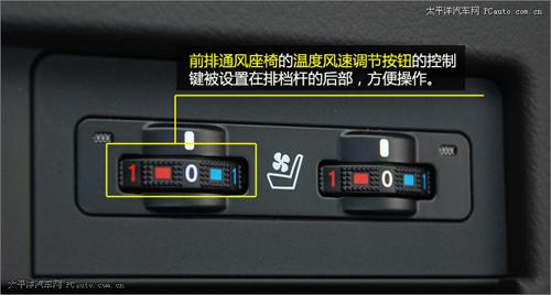 前排通風(fēng)座椅的溫度風(fēng)速調(diào)節(jié)按鈕的控制鍵被設(shè)置在排檔桿的后部,方便操作。在夏天極為炎熱的廣東地區(qū),該項(xiàng)功能顯得非常實(shí)用。