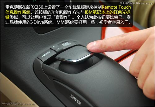 雷克薩斯在新RX350上設(shè)置了一個(gè)車載鼠標(biāo)鍵來(lái)控制最新的Remote Touch信息操作系統(tǒng)。該按鈕的功能和操作方法與IBM筆記本上的紅色光標(biāo)鍵類似,可以讓用戶實(shí)現(xiàn)“盲操作”。只需輕輕擺動(dòng)該按鈕,車載電腦屏幕上的鼠標(biāo)鍵便會(huì)按照指示移動(dòng)。個(gè)人認(rèn)為此按鈕要比寶馬、奧迪品牌使用的I-Dirve系統(tǒng)、MMI系統(tǒng)好用一些,初學(xué)者也容易入門。據(jù)悉,這套控制系統(tǒng)將逐步推廣到雷克薩斯全系車型上。