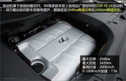 在新RX350上沿用了廣受好評的2GR-FE V6發(fā)動機。這款發(fā)動機經過重新調校后,動力輸出較舊款的RX350略有提升,能夠迸發(fā)204Kw峰值功率和346Nm峰值扭矩。最高時速可達200Km/h,0-100Km/h加速也僅需7.9s。先期引入國內的RX系列車型并沒有使用混合動力系統(tǒng),不過想必一向對環(huán)保十分重視的雷克薩斯品牌會在不久的將來將搭載有混合動力系統(tǒng)的RX車型引入到國內市場,豐富RX的產品線。