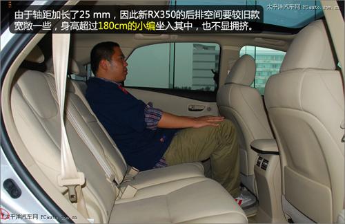 前文已經提過,新RX350的車身長度要較舊款長30 mm,軸距也較舊款長25mm,因此新RX350的后排空間要較舊款寬敞一些,身高超過180 cm的小編坐入其中,也不顯擁擠。不過由于車身高度較舊款車型有所降低,RX350后排的頭部空間與舊款相比沒有什么優(yōu)勢可言。