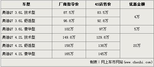 據(jù)經(jīng)銷商銷售人員介紹,奧迪Q7分為3.6L和4.2L兩種排量共7款車型,目前全系最高優(yōu)惠為20萬(wàn)元現(xiàn)金。3.6L中的技術(shù)型和舒適型優(yōu)惠4萬(wàn)元,優(yōu)惠后售價(jià)分別為:技術(shù)型83.5萬(wàn)元,舒適型92.8萬(wàn)元。3.6L豪華型經(jīng)5萬(wàn)元優(yōu)惠后售價(jià)降到了97萬(wàn)元。排量更大的4.2L車型優(yōu)惠更是達(dá)到了20萬(wàn)元,優(yōu)惠后售價(jià)分別為技術(shù)型129.8萬(wàn)元,舒適型138萬(wàn)元,豪華型145萬(wàn)元。