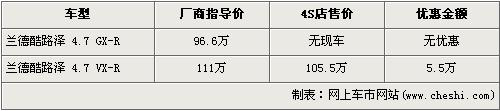據(jù)經(jīng)銷商銷售人員介紹,豐田-蘭德酷路澤分為4.0L和4.7L兩種排量,由于4.0L車型的尾氣排放是歐III標(biāo)準(zhǔn),沒有達到北京施行的歐IV標(biāo)準(zhǔn),所以北京限賣,店內(nèi)沒有4.0L車型。4.7L車型分為GX-R版和VX-R版,目前低配的4.7L GX-R車型沒有現(xiàn)車,所以不在此次優(yōu)惠的行列中。高配的VX-R版經(jīng)5.5萬元優(yōu)惠后的售價也降到了105.5萬元。