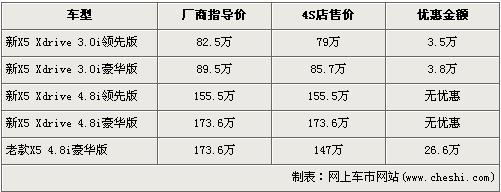 據(jù)經(jīng)銷商處銷售人員介紹,近期購買X5的消費者可以得到最高26.6萬元的優(yōu)惠。新款的寶馬X5 3.0L車型目前有買車送一半購置稅的活動,購置稅優(yōu)惠的價值可以直接抵車價,經(jīng)抵價轉(zhuǎn)換后,新X5 3.0i領(lǐng)先版和豪華版經(jīng)3.5及3.8萬元優(yōu)惠后售價降為了79萬元和85.7萬元,新寶馬X5 4.8i車型目前仍然沒有優(yōu)惠。銷售人員就介紹,老款的X5 4.8i豪華版有26.6萬元的高額優(yōu)惠,售價從173.6萬元降到了147萬元。