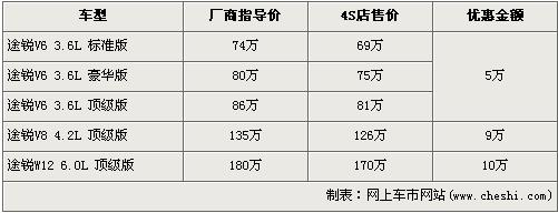 據(jù)經(jīng)銷商銷售人員介紹,目前店內(nèi)途銳全系均有不同優(yōu)惠,最高讓利達(dá)到了10萬元。搭載V6發(fā)動(dòng)機(jī)的3.6L車型優(yōu)惠現(xiàn)金5萬元,3.6L車型經(jīng)優(yōu)惠后售價(jià)分別為:標(biāo)準(zhǔn)型69萬元,豪華型75萬元,頂級(jí)型81萬元;搭載V8發(fā)動(dòng)機(jī)的3.6L頂級(jí)型經(jīng)9萬元優(yōu)惠后售價(jià)降到了126萬元;搭載W12發(fā)動(dòng)機(jī)的全系頂配車型6.0L頂級(jí)版經(jīng)10萬元的優(yōu)惠后售價(jià)從180萬降到了170萬元。