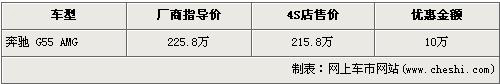 根據(jù)北京奔馳4S店銷售人員介紹,目前奔馳G55 AMG現(xiàn)金優(yōu)惠10萬元。經(jīng)優(yōu)惠后,奔馳G55 AMG售價(jià)從廠商指導(dǎo)價(jià)的225.8萬元下降到了215.8萬元。銷售人員還介紹,奔馳G55 AMG只有一部黑色現(xiàn)車在售,而且北京多家奔馳經(jīng)銷店均無現(xiàn)車,消費(fèi)者挑選的空間不大。顏色方面引進(jìn)國內(nèi)的G55 AMG只有黑色,其他顏色均不銷售。