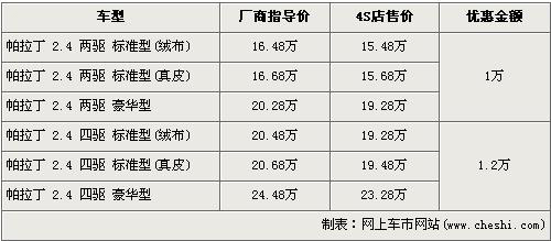 據(jù)4s店銷售人員介紹,帕拉丁兩驅(qū)車型的優(yōu)惠金額為1萬元,四驅(qū)車型的優(yōu)惠金額為1.2萬元。帕拉丁排量為2.4L,車系分為前置后驅(qū)和前置四驅(qū)兩種驅(qū)動形式,每種驅(qū)動形式中又分為標(biāo)準(zhǔn)版及豪華版,標(biāo)準(zhǔn)版分為絨布座椅或真皮座椅。絨布座椅全系最低配的帕拉丁 2.4兩驅(qū)標(biāo)準(zhǔn)版經(jīng)優(yōu)惠后售價降為15.48萬元,而操縱性能更加穩(wěn)健,全系最高配的帕拉丁 2.4四驅(qū)豪華版經(jīng)優(yōu)惠后售價也降到了23.28萬元。目前帕拉丁兩驅(qū)與四驅(qū)的豪華車型均無現(xiàn)車,欲購買的消費者需交訂金1萬元,兩周后可提車。