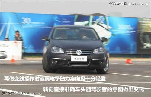 首先我們將速騰加速到80公里/小時,油門到底,車猛的竄了出去,再做變線操作時,電子助力方向盤十分輕盈,轉(zhuǎn)向直接準確,車頭隨駕駛者的意圖做出變化,只是在做出太大動作時,速騰的轉(zhuǎn)向不足的情況比較嚴重。在整個過程中速騰底盤表現(xiàn)出深厚的功底,“駕駛者之車”的美譽名副其實。