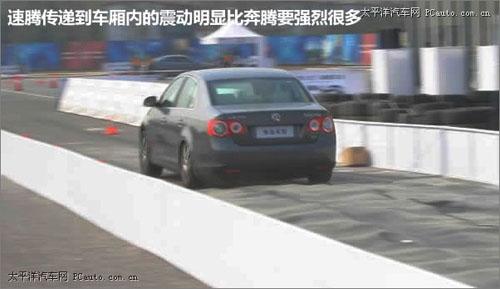 濕滑路面體驗這個項目主要是模擬冰雪路面的對于車輛的操控,在光滑的鋼板上潑上水附著力減小,在通過彎道時速騰依舊過早的出現(xiàn)轉(zhuǎn)向不足的情況,不過方向盤的指向依舊保持的較為精準。奔騰在高速過彎時側傾要小于速騰,不過路感不是特別清晰,電子穩(wěn)定系統(tǒng)起到的作用非常明顯,底盤在舒適性和運動性間找到了平衡點。