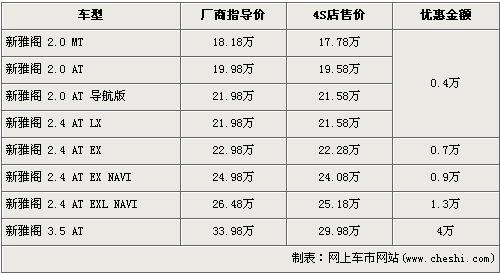 據(jù)4S店銷售人員介紹,目前新雅閣全系優(yōu)惠最高達到了4萬元。新雅閣分為2.0、2.4、3.5三個排量,全系最低配的2.0手動版經(jīng)4000元優(yōu)惠后售價降到了17.78萬元,2.4L車型高配的EXL NAVI版經(jīng)1.3萬元優(yōu)惠后售價降到了25.18萬元,而3.5排量車型優(yōu)惠4萬元達到了全系的最高。銷售人員還介紹,除了最低配的車型無現(xiàn)車外,其他車型均有現(xiàn)車。