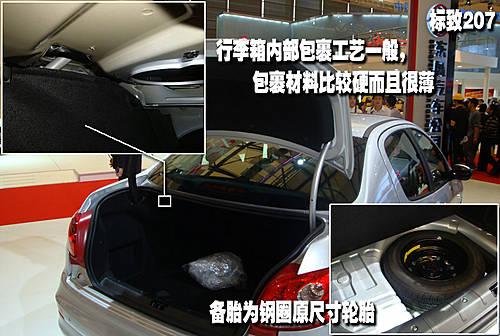 標(biāo)致207的隨車工具就放在備胎的旁邊,相比之前三款車型單獨(dú)設(shè)計(jì)的工具箱而言成本明顯更加低廉一些。其行李箱內(nèi)部的包裹材料質(zhì)地很硬并且厚度也明顯相比前三款車型更薄。