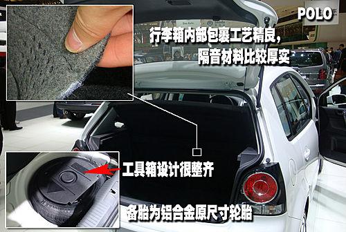 上海大眾polo是唯一標(biāo)配鋁合金輪轂全尺寸備胎的車型,行李箱內(nèi)部的包裹材料相比新建年華而言更加厚實(shí)和柔軟。位于備胎內(nèi)部分工具箱設(shè)計(jì)的很有特色,完全沒有凌亂的感覺非常的整齊。