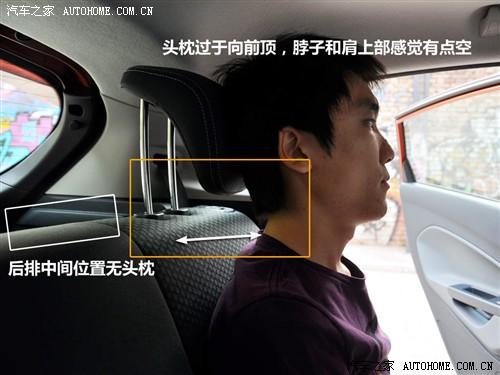 前排就是普通的手動六向調(diào)節(jié)方式,沒有什么可以特別說明的。而后排三人座只提供了兩個頭枕,頭枕可以上下調(diào)節(jié),但是過于向前探出,就會頂著人的后腦勺,使脖子部位懸空,感覺不是很舒適。而且,沒有車頂拉手給乘客用來維持身體平衡讓人很不習慣。