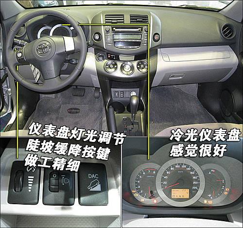 豐田國(guó)產(chǎn)RAV4凸顯出該車的運(yùn)動(dòng)風(fēng)格,在內(nèi)飾設(shè)計(jì)上采用深色設(shè)計(jì)。兩小一大的冷光儀表盤,感覺(jué)很舒服,駕駛員可以查看比較輕松。儀表盤燈光調(diào)節(jié)、陡坡緩降按鍵位于方向盤左側(cè),用料感覺(jué)相對(duì)比較精細(xì)。