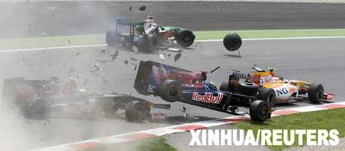 5月10日,紅牛二隊(duì)車(chē)手布爾代(前中)和隊(duì)友布埃米(前左)以及印度力量車(chē)隊(duì)車(chē)手蘇蒂爾(后)、雷諾車(chē)隊(duì)車(chē)手皮蓋駕駛的賽車(chē)發(fā)生碰撞。當(dāng)日,F(xiàn)1西班牙大獎(jiǎng)賽落幕,布朗GP車(chē)隊(duì)的英國(guó)車(chē)手巴頓奪得冠軍。新華社/路透