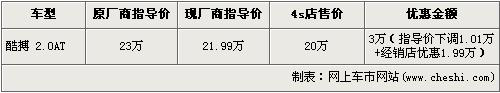 根據(jù)4s店銷售人員介紹,目前官方對酷博 2.0 AT版車型的廠商指導(dǎo)價下調(diào)了1.01萬元,下調(diào)后廠商指導(dǎo)價從23萬元降到了21.99萬元,并且在店內(nèi)購車的消費(fèi)者還可以得到經(jīng)銷店送出的1.99萬元的優(yōu)惠。經(jīng)總優(yōu)惠后,道奇酷博的售價降到了20萬,F(xiàn)車方面,店內(nèi)酷搏現(xiàn)車不多,錯過的消費(fèi)者只能交1萬元訂金,下個月才可提車。