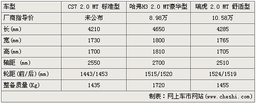 在基本參數(shù)方面,獵豹CS7要比源自轎車平臺(tái)的瑞虎還要小一些,車長只有4210mm,但軸距要比瑞虎大一些,當(dāng)然三款車中哈弗H3明顯要大一號(hào),無論車長還是軸距方面。也就意味著從外觀上看,哈弗H3將很大氣,而獵豹CS7要小巧一些。