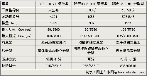 在動(dòng)力方面,三款車中獵豹只有2.0L排量可選,而哈弗有2.0L、2.4L以及2.8T柴油可選,而瑞虎也有1.6L、1.8L和2.0L 可以選擇,以2.0L的動(dòng)力對比來看,瑞虎的SQR484F發(fā)動(dòng)機(jī)從數(shù)據(jù)上看最為強(qiáng)勁,而哈弗H3的4G63在低速扭矩方面具有優(yōu)勢。在懸架系統(tǒng)方面,三款車中CS7采用了偏重越野的整體橋式后懸掛,但舒適性上不如另兩款車型。