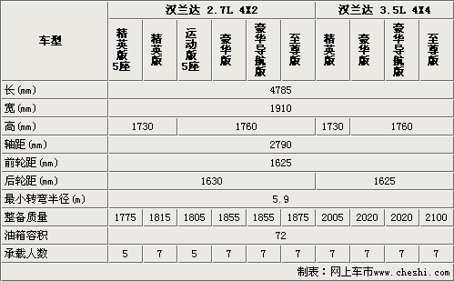 國產(chǎn)漢蘭達的車身尺寸與進口車型相同,由于國產(chǎn)漢蘭達精英型沒有配備車頂行李架,所以要比運動版、豪華版和至尊版矮了30mm。將近2.8米的軸距為漢蘭達提供了舒適的內(nèi)部空間。國產(chǎn)漢蘭達較進口車型有添加了5座車型,進一步滿足了不同消費者的需求(進口車型均為7座車型)。國產(chǎn)漢蘭達的轉(zhuǎn)彎半徑僅為5.9米,保證了該車型的道路通過性。