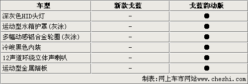 新款戈藍(lán)還增加了戈藍(lán)韻動版車型,這款新車在整車的設(shè)計方面都有新的變化。在外觀方面,戈藍(lán)韻動版采用深灰色HID大燈、運(yùn)動型灰色涂裝水箱護(hù)罩以及多幅動感鋁合金輪轂。內(nèi)飾方面采用了黑色內(nèi)飾風(fēng)格,配備了12聲道環(huán)繞立體聲喇叭和運(yùn)動型金屬踏板,使整車看上去更具運(yùn)動氣質(zhì)。