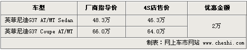 筆者從英菲尼迪北京地區(qū)經(jīng)銷商處了解到,目前英菲尼迪G37銷售的車型包括四門版和兩門版車型,售價為48.3萬和66萬。現(xiàn)在消費者購車的話可以優(yōu)惠2萬元的現(xiàn)金,優(yōu)惠后售價為46.3萬元。這款車有銀色、黑色、紅色、白色/藍(lán)色等可提供給消費者選擇,購車的消費者可到店具體咨詢。