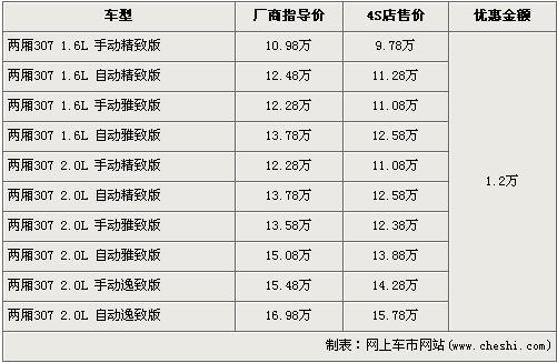 據(jù)東風標致經(jīng)銷店銷售人員介紹,兩廂標致307分為1.6L和2.0L兩種排量,目前優(yōu)惠1.2萬元,入門車型的1.6L 手動精致版原廠商指導(dǎo)價為10.98萬元,經(jīng)優(yōu)惠后僅售9.78萬元,排量稍大的2.0L排量的低配車型手動精致版經(jīng)優(yōu)惠后售價為11.08萬元,F(xiàn)車方面,1.6L車型現(xiàn)車充足,2.0L車型則現(xiàn)車緊張,挑選空間不大。