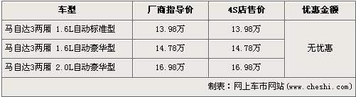 據(jù)經(jīng)銷商處銷售人員介紹:目前店內(nèi)僅馬自達3兩廂1.6L車型有少量現(xiàn)車,顏色以紅和黑為主。2.0L車型已沒有現(xiàn)車,但4S店接受預(yù)定,不過提車時間不能確定。